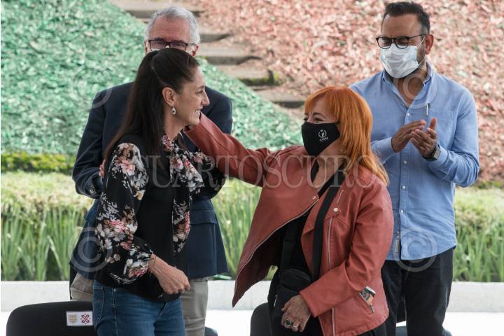 Claudia Sheinbaum Pardo, jefa de gobierno de la capital, y Rosario Piedra Ibarra, presidenta de la Comisión Nacional de los Derechos Humanos, durante la presentación del Proyecto "Tlaxcoaque: Sitio de Memoria".