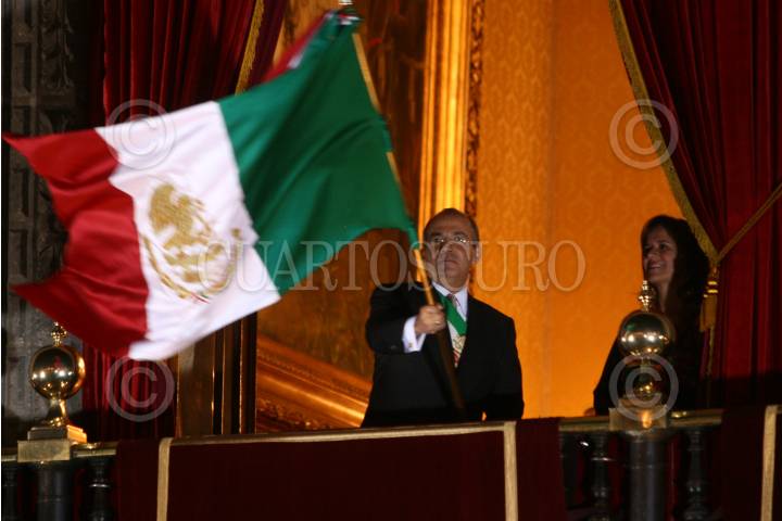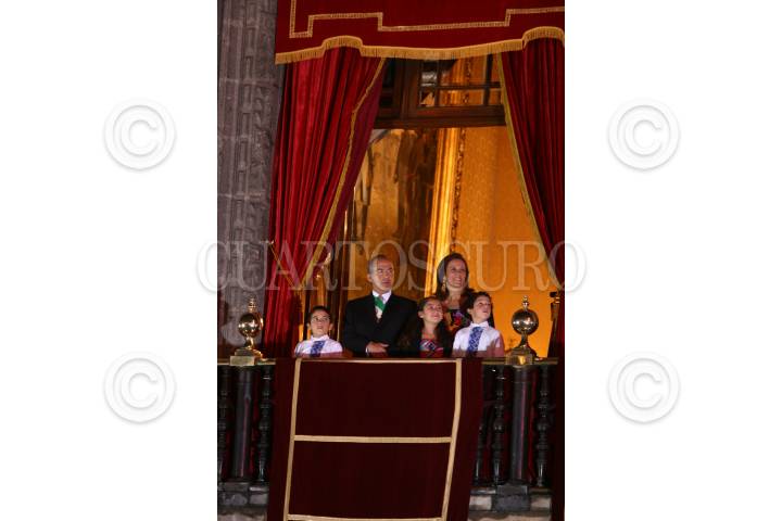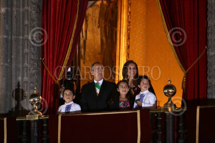 MÉXICO D.F.,15SEPTIEMBRE008.- Ante miles de mexicanos, el Presidente de México Felipe Calderón ondeo la bandera nacional y tocó la campana de Dolores acompañado por su familia ,desde el balcón central de Palacio Nacional, al conmemorar el 198 aniversario del inicio de la Independencia. FOTO: SÁSHENKA GUTIÉRREZ/CUARTOSCURO.COM