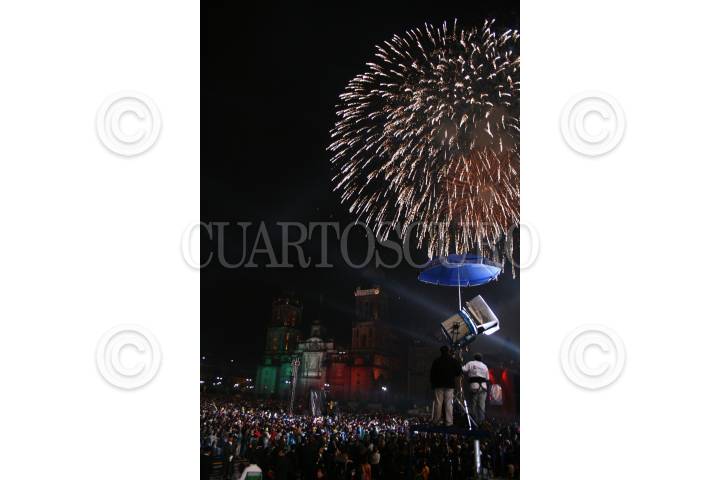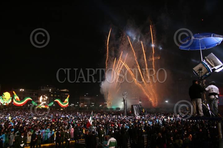 MÉXICO D.F.,15SEPTIEMBRE008.- Miles de mexicanos, se dieron cita en la plancha del zócalo capitalino para dar el grito de independencia ceremonia encabezadapor el Presidente de México Felipe Calderon en donde ondeo la bandera nacional y tocó la campana de Dolores acompañado por su familia ,desde el balcón central de Palacio Nacional, al conmemorar el 198 aniversario del inicio de la Independencia. FOTO: SÁSHENKA GUTIÉRREZ/CUARTOSCURO.COM
