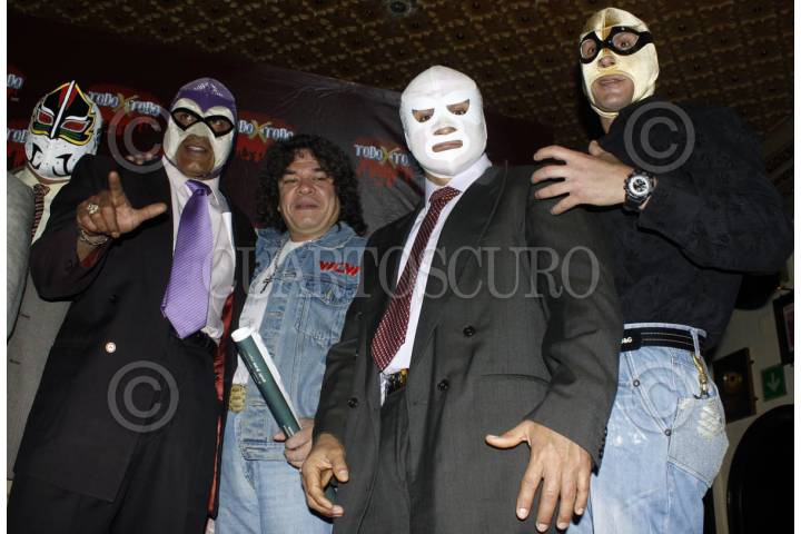 MÉXICO, D.F., 16MARZO2012.- Los luchadores Mascara Sagrada, el Dandy, Angel Blanco, y el Hijo del Solitario, durante la presentación de la función que se llevará a cabo el próximo 31 de Marzo, La lucha estelar se jugará la mascara el Hijo del Santo vs el Hijo del Solitario y Ángel Blanco jr. FOTO: IVAN MENDEZ /CUARTOSCURO.COM
