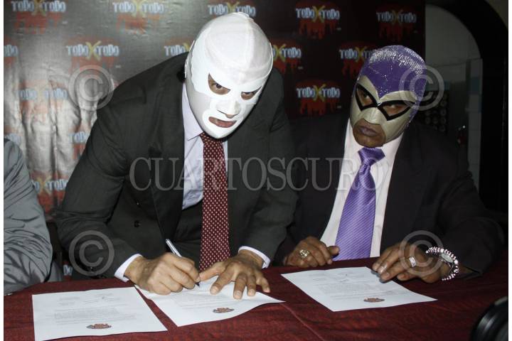 MÉXICO, D.F., 16MARZO2012.- Los luchadores Angel Blanco Junior, y El Hijo del Fantasma, durante la presentación de la función que se llevará a cabo el próximo 31 de Marzo, en la lucha estelar se jugarán la mascara el Hijo del Santo Villano IV contra el Hijo del Solitario y Ángel Blanco jr. FOTO: IVAN MENDEZ /CUARTOSCURO.COM