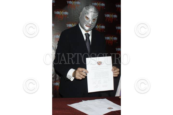 MÉXICO, D.F., 16MARZO2012.- Mascara Sagrada, durante la presentación de la función que se llevará a cabo el próximo 31 de Marzo, en la lucha estelar se jugarán la mascara el Hijo del Santo Villano IV contra el Hijo del Solitario y Ángel Blanco jr. FOTO: IVAN MENDEZ /CUARTOSCURO.COM