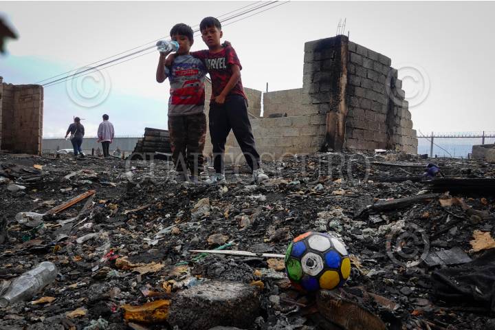 NEZAHUALCÓYOTL, ESTADO DE MÉXICO,03JULIO2024.- Debido a una supuesta toma clandestina de turbosina, el pasado lunes un predio irregular se incendió consumiendo 11 casas. En imagen niños juegan en los escombros tras mencionado hecho. FOTOS: ROGELIO MORALES /CUARTOSCURO.COM