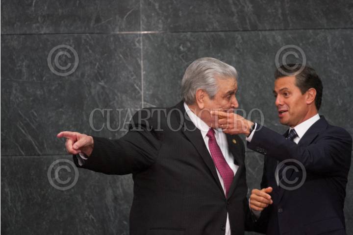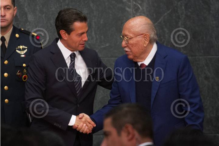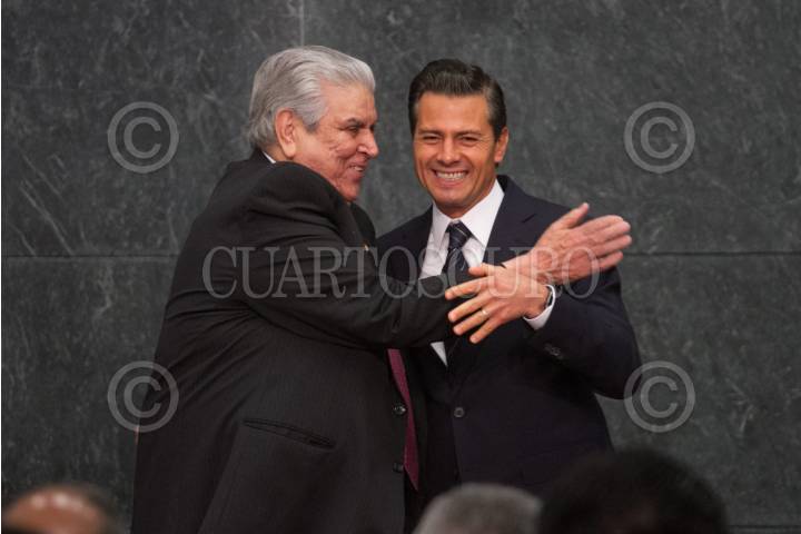 CIUDAD DE MÉXICO, 17ABRIL2017.- Enrique Peña Nieto, Presidente de México, y Abel Domínguez Rivero, presidente saliente del Congreso del Trabajo y presidente vitalicio de la Confederación de Trabajadores y Campesinos (CTC), durante la toma de nota y protesta de la directiva 2017 del Congreso del Trabajo, en la residencia oficial de Los Pinos. FOTO: MOISÉS PABLO /CUARTOSCURO.COM