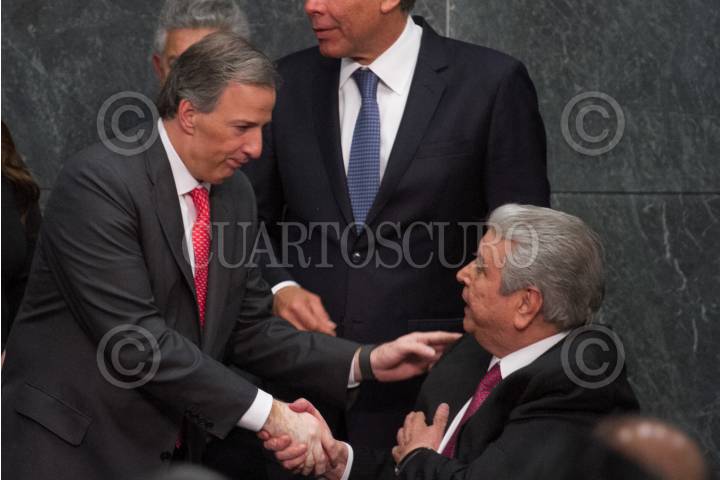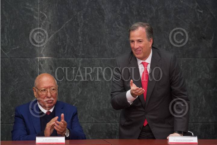 CIUDAD DE MÉXICO, 17ABRIL2017.- Abel Domínguez Rivero, presidente saliente del Congreso del Trabajo y presidente vitalicio de la Confederación de Trabajadores y Campesinos (CTC), y José Antonio Meade, secretario de Hacienda y Crédito Público, durante la toma de nota y protesta de la directiva 2017 del Congreso del Trabajo, en la residencia oficial de Los Pinos. FOTO: MOISÉS PABLO /CUARTOSCURO.COM
