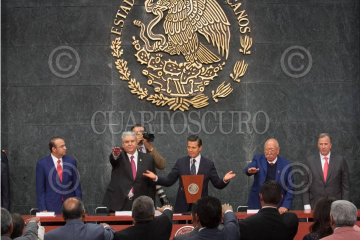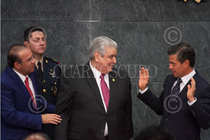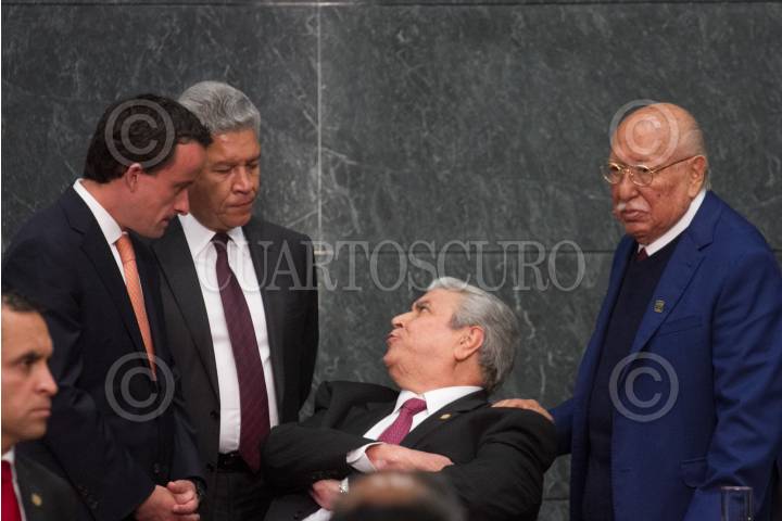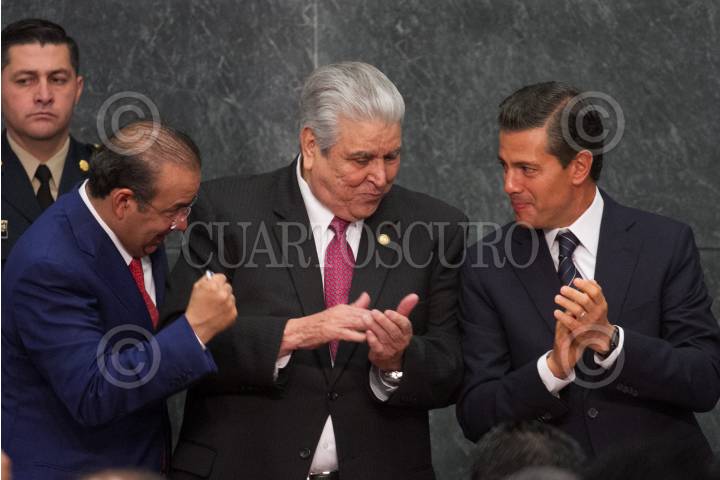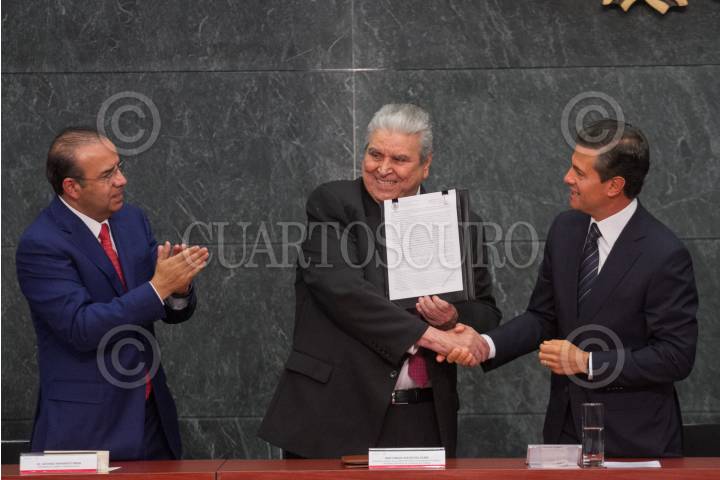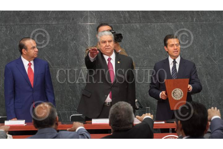 CIUDAD DE MÉXICO, 17ABRIL2017.- Mikel Arriola, director del IMSS; David Penchyna, director del Infonavit; Abel Domínguez Rivero, presidente saliente del Congreso del Trabajo y presidente vitalicio de la Confederación de Trabajadores y Campesinos (CTC), y Carlos Aceves del Olmo, secretario general de la Confederación de Trabajadores de México y presidente entrante del Congreso del Trabajo, durante la toma de nota y protesta de la directiva 2017 del Congreso del Trabajo, en la residencia oficial de Los Pinos. FOTO: MOISÉS PABLO /CUARTOSCURO.COM