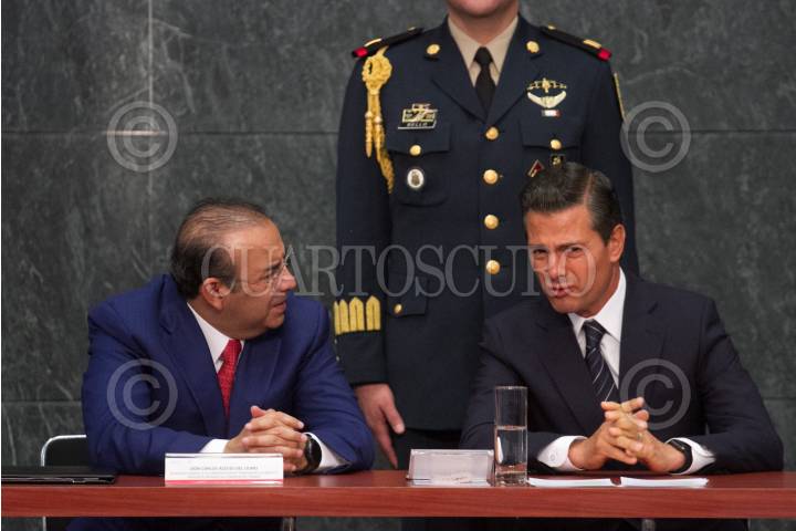CIUDAD DE MÉXICO, 17ABRIL2017.- José Antonio Meade Kuribreña, secretario de Hacienda y Crédito Público (SHCP), y Carlos Aceves del Olmo, secretario general de la Confederación de Trabajadores de México y presidente entrante del Congreso del Trabajo, durante la toma de nota y protesta de la directiva 2017 del Congreso del Trabajo, en la residencia oficial de Los Pinos. FOTO: MOISÉS PABLO /CUARTOSCURO.COM