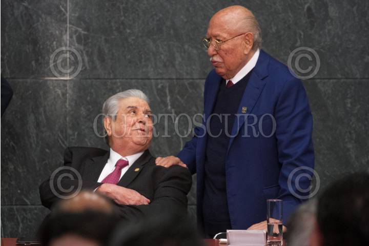 CIUDAD DE MÉXICO, 17ABRIL2017.- Carlos Aceves del Olmo, secretario general de la Confederación de Trabajadores de México y presidente entrante del Congreso del Trabajo, y Abel Domínguez Rivero, presidente saliente del Congreso del Trabajo y presidente vitalicio de la Confederación de Trabajadores y Campesinos (CTC), durante la toma de nota y protesta de la directiva 2017 del Congreso del Trabajo, en la residencia oficial de Los Pinos. FOTO: MOISÉS PABLO /CUARTOSCURO.COM