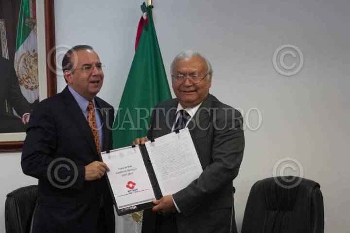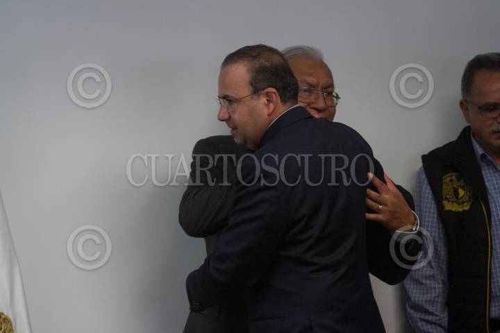 CIUDAD DE MÉXICO, 11MAYO2017.- Alfonso Navarrete Prida, secretario del Trabajo y Previsión Social (STPS), y Agustín Rodríguez, secretario general del Sindicato de Trabajadores de la Universidad Nacional Autónoma de México (STUNAM), durante la toma de nota del cambio de directiva del STUNAM periodo 2017-2020. FOTO: MOISÉS PABLO /CUARTOSCURO.COM