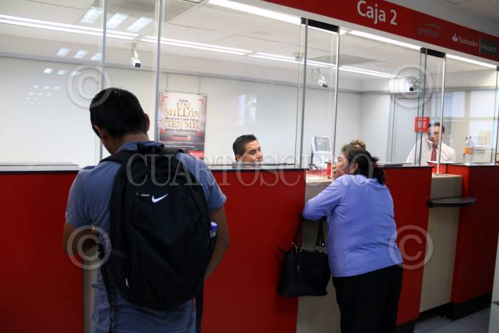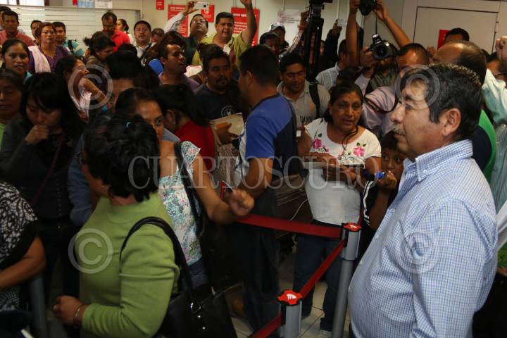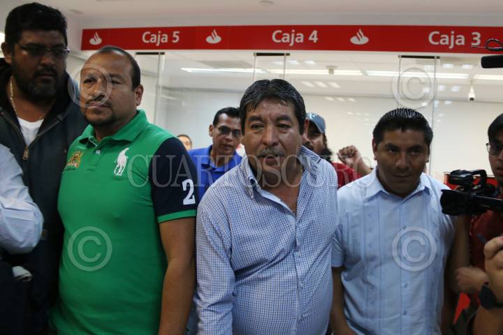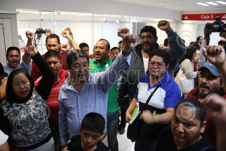 OAXACA, OAXACA, 15ENERO2015.- Maestros adheridos a la sección 22 de la CNTE tomaron las instalaciones de la matriz del banco Santander para exigir el pago a más de 11 mil trabajadores de todo el estado a quienes no se les han pagado diversos cheques pertenecientes al ejercicio fiscal 2014. La dirigencia encabezada por Rubén Núñez Ginez ingresaron al banco ubicado en la calle de Independencia y señalaron que no se retirarían en tanto no se iniciara con el pago, minutos más tarde el gerente informó que el cobro de los cheques se iniciaría a la brevedad pues el recurso acababa de ser depositado. FOTO: ARTURO PÉREZ ALFONSO /CUARTOSCURO.COM