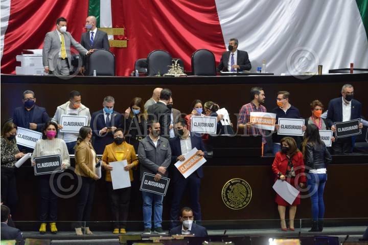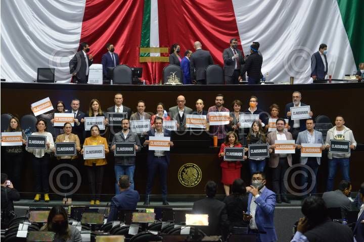 Dante Delgado, dirigente nacional de Movimiento Ciudadano, y legisladores del mismo grupo parlamentario, toman la tribuna previo a la instalación de Comisión Permanente del Congreso de la Unión