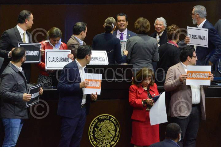 Dante Delgado, dirigente nacional de Movimiento Ciudadano, y legisladores del mismo grupo parlamentario, toman la tribuna previo a la instalación de Comisión Permanente del Congreso de la Unión.