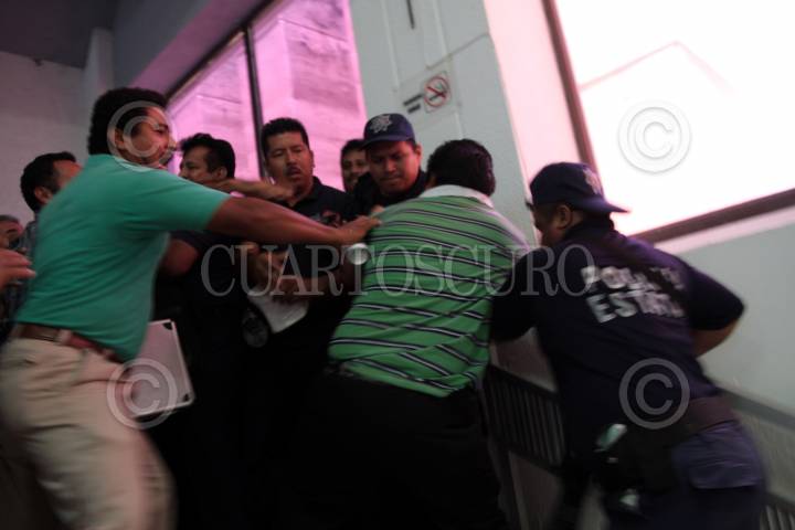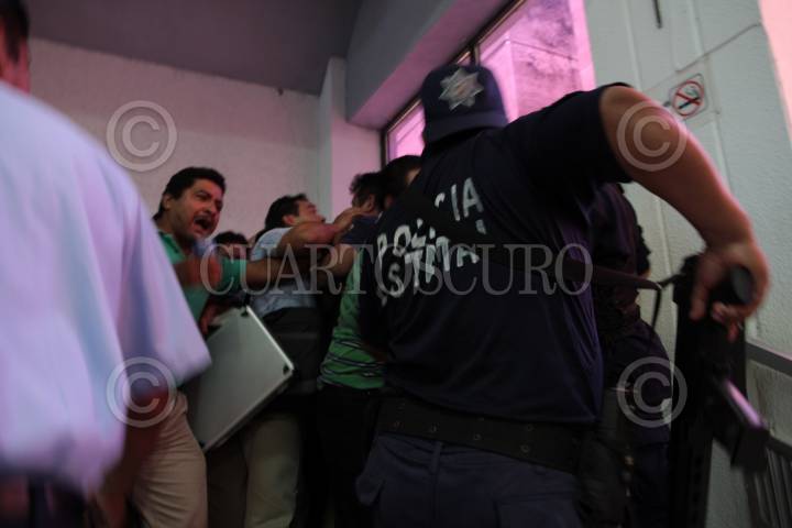 VILLAHERMOSA, TABASCO, 15JULIO2009.- Sindicalizados del SUSET tomaron a las fuerzas las oficinas de la Secretaría de Finanzas, por lo que se protagonizaron enfrentamientos entre elementos de Seguridad Privada y elementos uniformados de la Secretaria de Seguridad Pública, quienes en más de una ocasión amenazaron con realizar disparos. En este disturbio resultaron tres personas lesionadas y que fueron golpeados por policías. FOTO: MARCO POLO GUZMÁN HERNÁNDEZ/CUARTOSCURO.COM