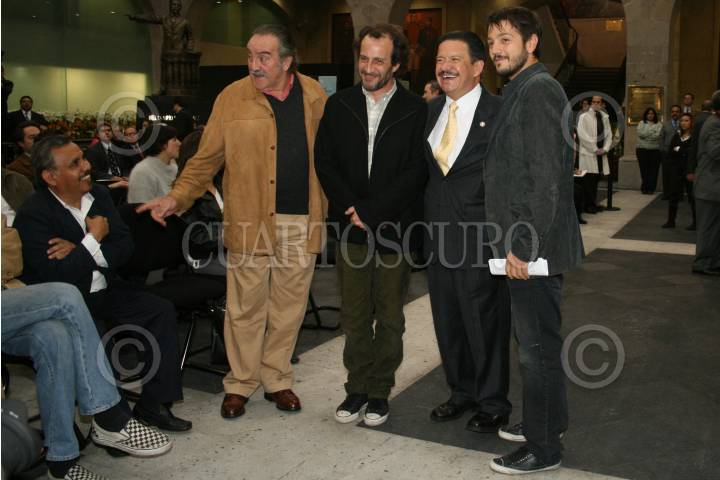 MÉXICO, D.F., 27OCTUBRE2009.- Los actores Pedro Armendariz, Daniel Gimenez Cacho, y Diego Luna se tomaron una fotografia con el Senador Carlos Navarrete, durante a su visita al Senado para protestar contra los recortes al Imcine. FOTO: SÁSHENKA GUTIÉRREZ/CUARTOSCURO.COM