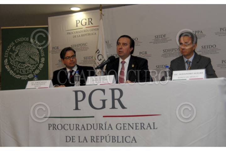 MÉXICO, D.F., 25NOVIEMBRE2014.- Tres personas fueron detenidas por presuntamente fabricar poco más de 17 mil billetes falsos de 500 pesos, informó este martes la Procuraduría General de la República (PGR) y el Banco de México (Banxico). Las tres personas detenidas en Guanajuato el 18 de noviembre, de nombre Marco Antonio Palacios, Issac Zárate y Jaime Flores, presuntamente forman parte de una banda dedicada a la falsificación de billetes principalmente de 500 pesos, cuya primera pieza se detectó en abril de 2012 en instituciones de crédito. El director de la Agencia de Investigación Criminal (AIC) de la PGR, Tomás Zerón de Lucio, indicó que agentes bajo su mando realizaron operativos en las ciudades de Celaya, Salamanca y Valle de Santiago, Guanajuato, donde desmantelaron una imprenta clandestina, y confiscaron armas, vehículos y 300 mil pesos en efectivo. Al respecto, el director general de Emisiones y cajero principal de Banxico, Alejandro Alegre Rabiela, indicó que la Sedena también participó en los cateos. FOTO: PGR /CUARTOSCURO.COM