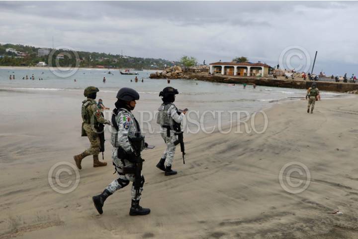 SAN PEDRO MIXTEPEC, OAXACA, 17JUNIO2025.- Elementos de la Guardia Nacional realizaron un recorrido por la playa principal en Puerto Escondido ante el avance de la tormenta tropical Erick que de acuerdo a los pronósticos afectará las costas de Oaxaca. FOTO: CAROLINA JIMÉNEZ MARISCAL/CUARTOSCURO.COM