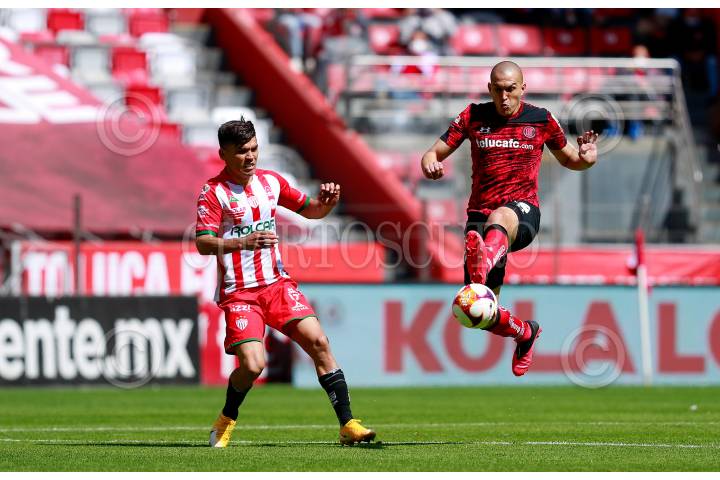 Miguel Barbieri defensa de los Diablos Rojos del Toluca y Martín Barragán delantero de los Rayos del Necaxa durante el encuentro en el Estadio Nemesio Diez.