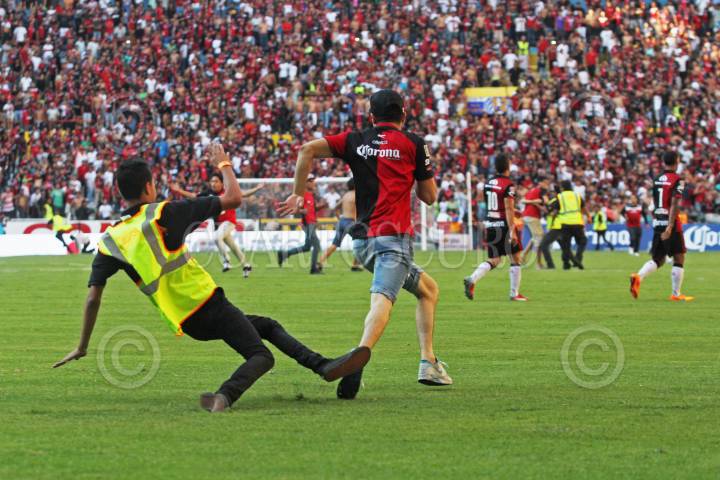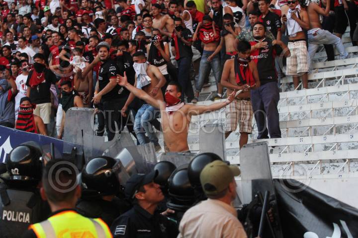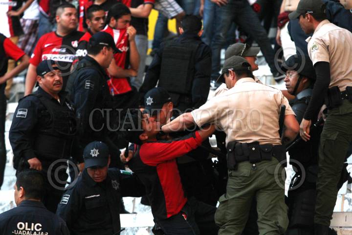 GUADALAJARA, JALISCO. 17MAYO2015.-Aficionados de la barra del Atlas protagonizaron un enfrentamiento a golpes con policías de Guadalajara en el estadio Jalisco, asi como algunos aficionados invadieron la cancha, esto durante el partido correspondiente a la vuelta de los Cuartos de Final del Torneo Clausura 2015 de la Liga MX, en donde se enfrentan los equipos de las Chivas de Guadalajara frente a las los Zorros del Atlas. FOTO: FERNANDO CARRANZA GARCIA / CUARTOSCURO.COM