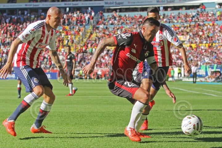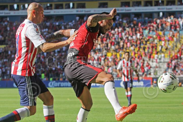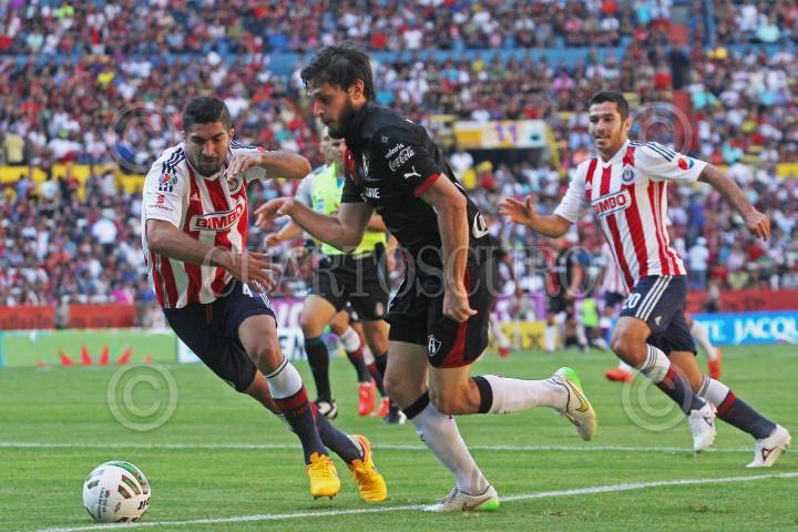 GUADALAJARA, JALISCO. 17MAYO2015.- El jugador del Atlas Rodrigo Millar, disputa un balón frente al contrario de Chivas Jorge Enríquez, esto en partido correspondiente a la vuelta de los Cuartos de Final del Torneo Clausura 2015 de la Liga MX, en donde se enfrentan los equipos de las Chivas de Guadalajara frente a las Zorros del Atlas, en partido que se juega en el Estadio Jalisco. FOTO: FERNANDO CARRANZA GARCIA / CUARTOSCURO.COM