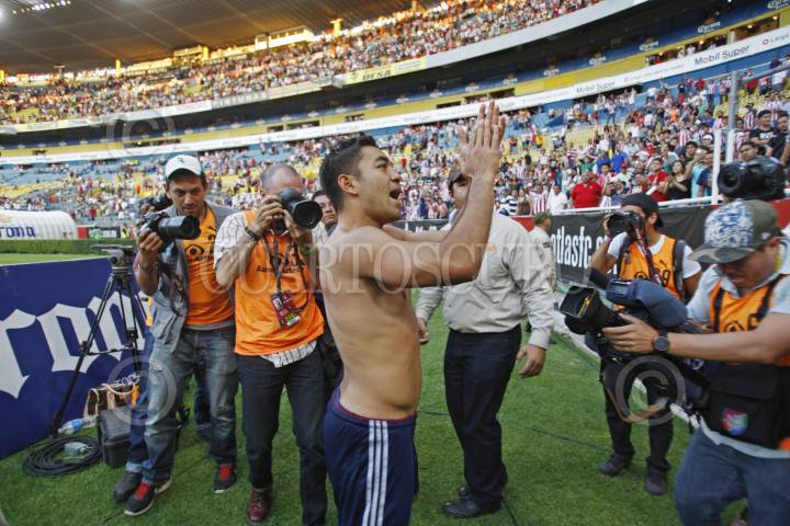 GUADALAJARA, JALISCO. 17MAYO2015.- El jugador de Chivas Marco Fabián, celebra una de sus tres anotaciones en el juego, esto en partido correspondiente a la vuelta de los Cuartos de Final del Torneo Clausura 2015 de la Liga MX, en donde se enfrentan los equipos de las Chivas de Guadalajara frente a las los Zorros del Atlas , en partido que se juega en el Estadio Jalisco. FOTO: FERNANDO CARRANZA GARCIA / CUARTOSCURO.COM