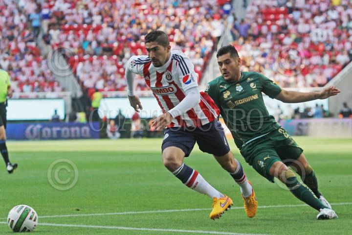 ZAPOPAN, JALISCO. 24MAYO2015.- El jugador de Chivas Omar Bravo, disputa un balón frente al contrario de Santos Carlos Izquierdoz, en el partido correspondiente al juego de vuelta de las Semifinales del Torneo Clausura 2015 de la Liga MX, en donde se enfrentaron los equipos de las Chivas de Guadalajara frente a Santos Laguna. El partido se disputó en el Estadio Omnilife y el marcador final fue de 3-0 a favor del equipo visitante. FOTO: FERNANDO CARRANZA GARCíA /CUARTOSCURO.COM
