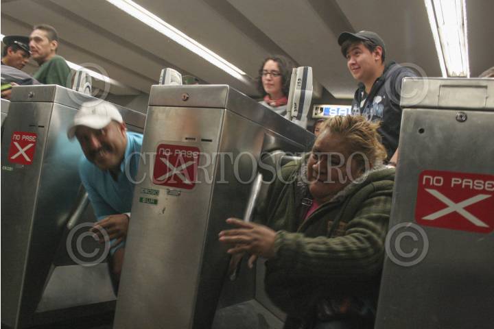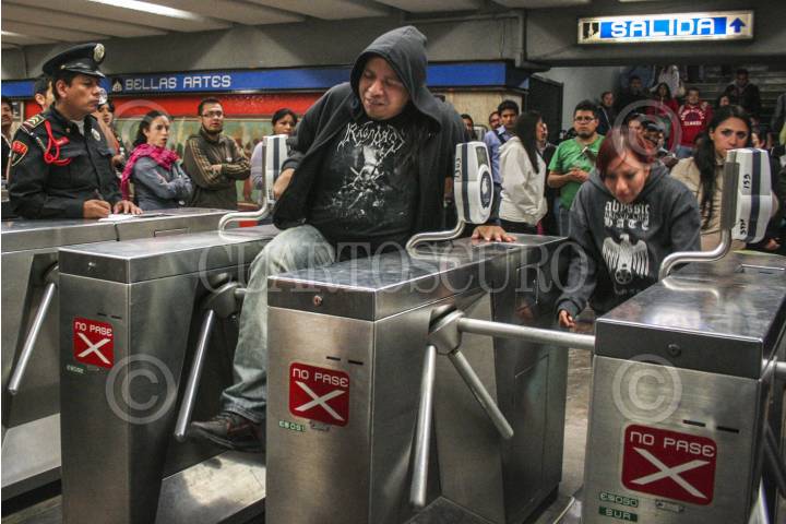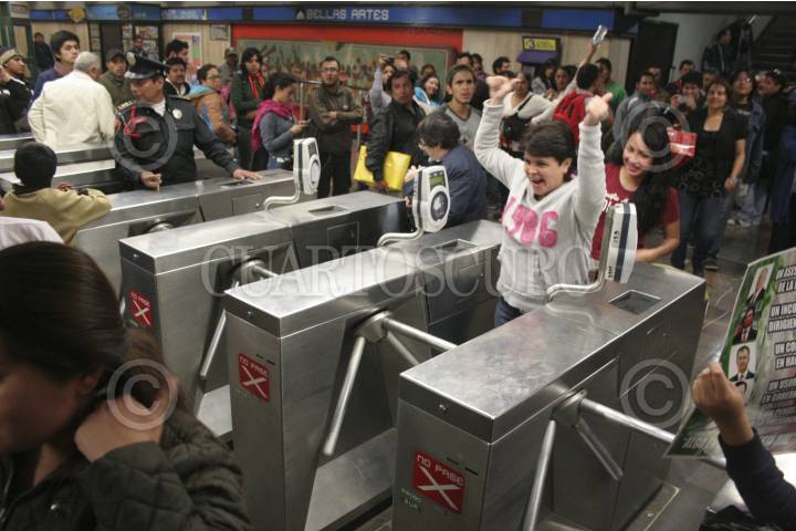 MÉXICO, D.F., 11DICIEMBRE2013.- Un grupo de jóvenes con pancartas en mano y gritando consignas ante el alza de la tarifa del Metro de 3 a 5 pesos abrió los torniquetes de la entrada a la estación Bellas Artes para que los usuarios pasaran gratis. FOTO: ENRIQUE ORDÓÑEZ /CUARTOSCURO.COM