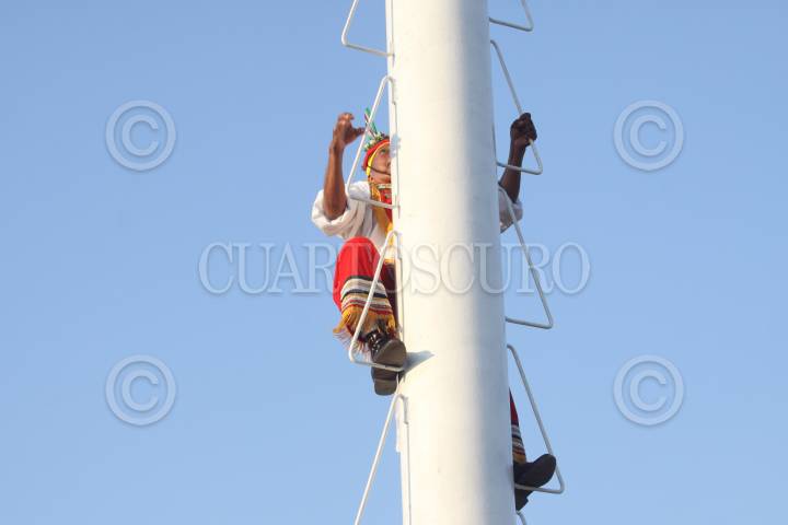 PAPANTLA, VERACRUZ, 21MARZO2010.-Ceremonia Ritual de la Danza de los Voladores quienes 2009 La UNESCO reconoció a la Ceremonia Ritual de Voladores como Patrimonio Cultural Intangible de la Humanidad. Esta danza prehispánica con mas de 2500 años de antiguedad gira en torno al arbol o palo del volador considerado el axis mundi transmisor entre el inframundo, la Tierra y el Cosmos; esto se presenta como parte de las actividades Cumbre Tajín 2010. FOTO: SÁSHENKA GUTIÉRREZ/CUARTOSCURO.COM