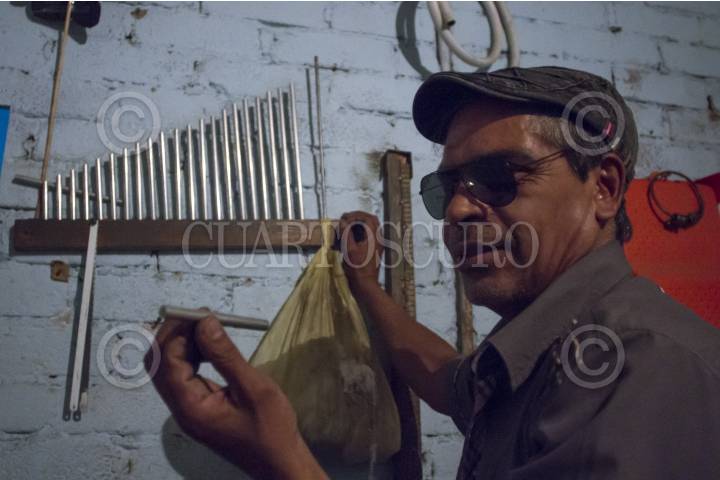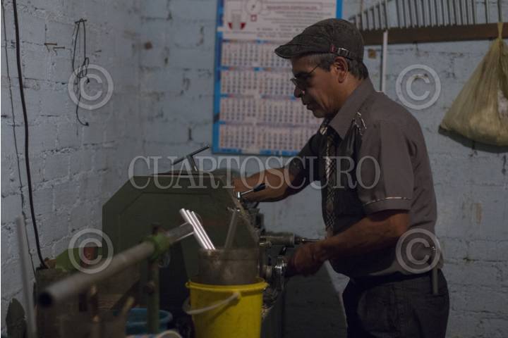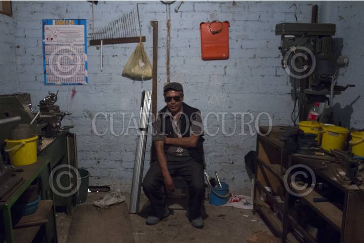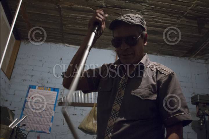 VALLE DE CHALCO, ESTADO DE MÉXICO, 07JUNIO2014.- El Taller de Miguel Canela, ubicado en Valle de Chalco por casi ya 8 años, es en la ciudad uno de los mas reconocidos en el mundo de los invidentes, cabe resaltar que a diferencia de muchas otras fabricas dedicadas a los invidentes, este es único que es por un vidente. Miguel Canela perdió la vista a la edad de 23 año en un accidente cuando cursaba la ingeniería en el Politécnico; oriundo de Veracruz, de niño aprendió gracias a sus tíos el uso de los tornos y maquinas de taller lo que actualmente le ha llevado a crear el propio. FOTO: ENRIQUE ORDÓÑEZ /CUARTOSCURO.COM