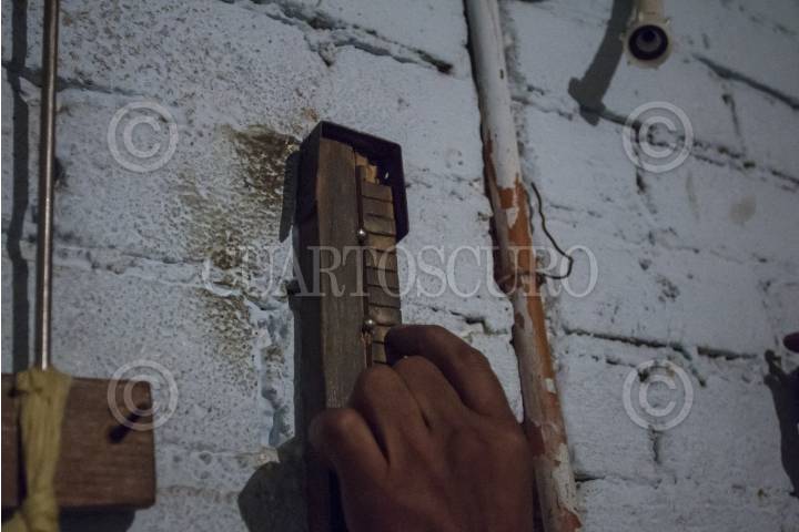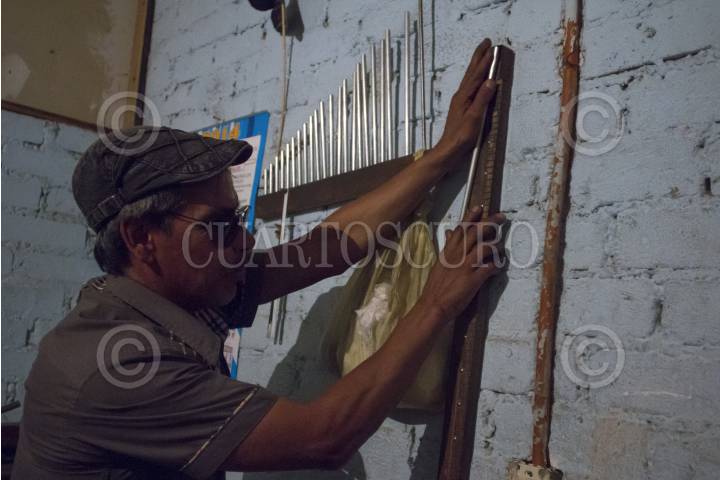 VALLE DE CHALCO, ESTADO DE MÉXICO, 07JUNIO2014.- En su pequeño taller, tiene todo perfectamente acomodado a modo que cuando estire la mano encuentre los artículos requeridos. En la Pared se aprecian los tamaños de cada una de las piezas que realiza para la elaboración de sus bastones, los cuales son de aluminio y latón. FOTO: ENRIQUE ORDÓÑEZ /CUARTOSCURO.COM