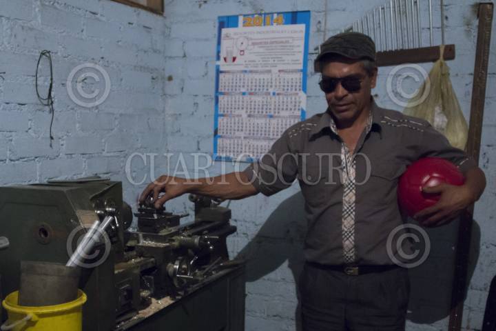 VALLE DE CHALCO, ESTADO DE MÉXICO, 07JUNIO2014.- En su Taller, “Canela” como es mejor conocido por su amigos, modifico al torno para las necesidades que requiere y por seguridad al ser una persona “ciega” como el menciona, debe tener mas seguridad. FOTO: ENRIQUE ORDÓÑEZ /CUARTOSCURO.COM