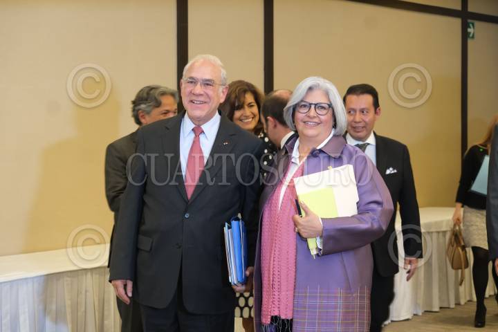 José Ángel Gurría Treviño, secretario General de la Organización para la Cooperación y Desarrollo Económicos (OCDE), y Graciela Márquez, secretaria de Economía, durante la llegada a la presentación "Perspectivas Económicas Mundiales".