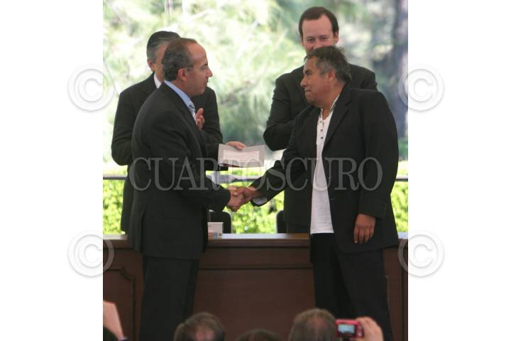 MÉXICO, D.F., 27ENERO2010.- Felipe Calderón Hinojosa, Presidente de México, le entregó un cheque para apoyar su proyecto su tortillería "Madina" a Iganacio Marquez Hernández en el marco del arranque del programa Fortalecimiento de la Cadena "Mi Tortilla", en la residencia oficial de Los Pinos. FOTO: MOISÉS PABLO/CUARTOSCURO.COM