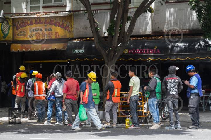 CIUDAD DE MÉXICO, 02AGOSTO2018.- Trabajadores de la construcción hacen fila para compras las tortillas durante su hora de comida, en la colonia Condesa. FOTO: MOISÉS PABLO /CUARTOSCURO.COM
