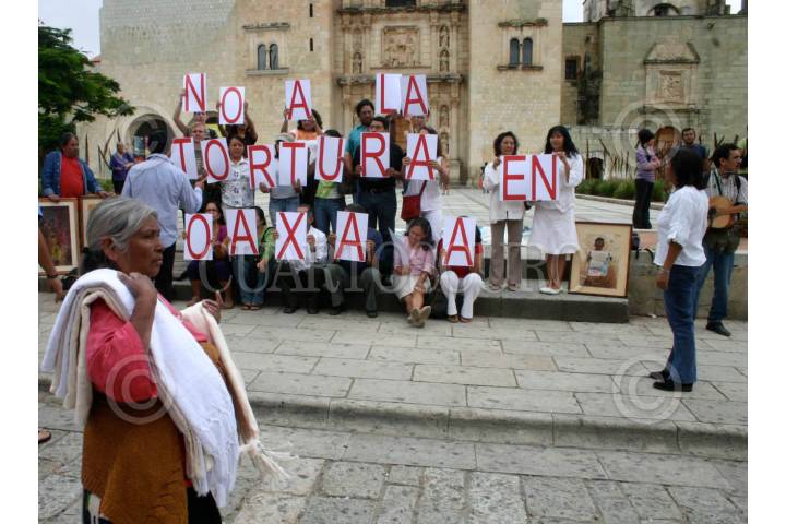 OAXACA , OAXACA 26JUNIO2008.-Con motivo del día internacional de las naciones unidas en apoyo de victimas de tortura. Organizaciones civiles encargadas de ayudar a diferentes sectores de la sociedad, se manifestaron día en la plaza de Santo domingo de Guzmán, donde con pancartas, pidieron la erradicación total de penas crueles, inhumanas y degradantes en Oaxaca. FOTO: MAX NÚÑEZ/CUARTOSCURO.COM