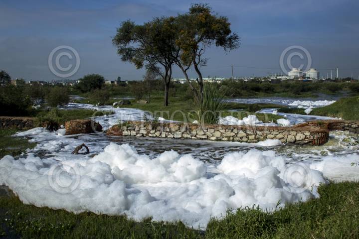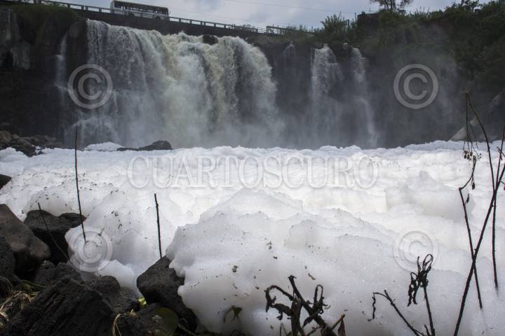 JUANACATLAN, JALISCO, 14MARZO2015.- Una de las características de la cascada del Salto en Jalisco es el olor impregnante que emana de sus aguas, asi como la gran cantidad de espuma generada en la cascada, misma que con el viento se eleva, dispersándose por la zona y que causa enfermedades de la piel. FOTO: ENRIQUE ORDÓÑEZ /CUARTOSCURO.COM