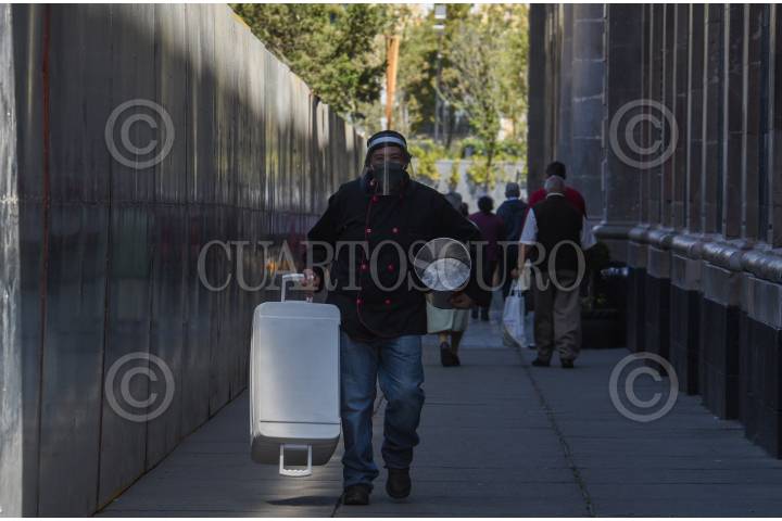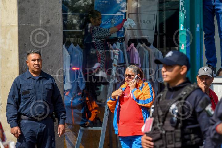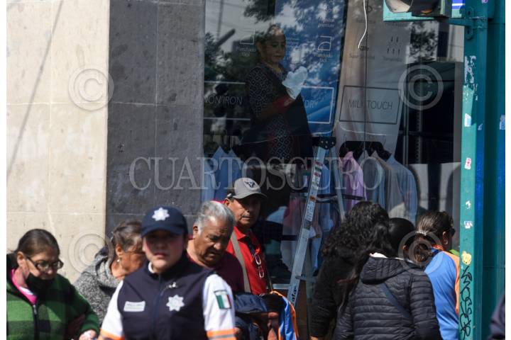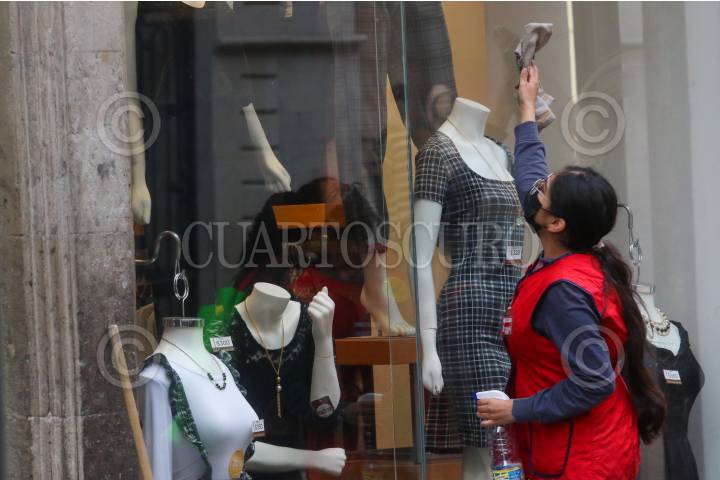 Una emplea limpia el aparador de una tienda en la calle de Madero.