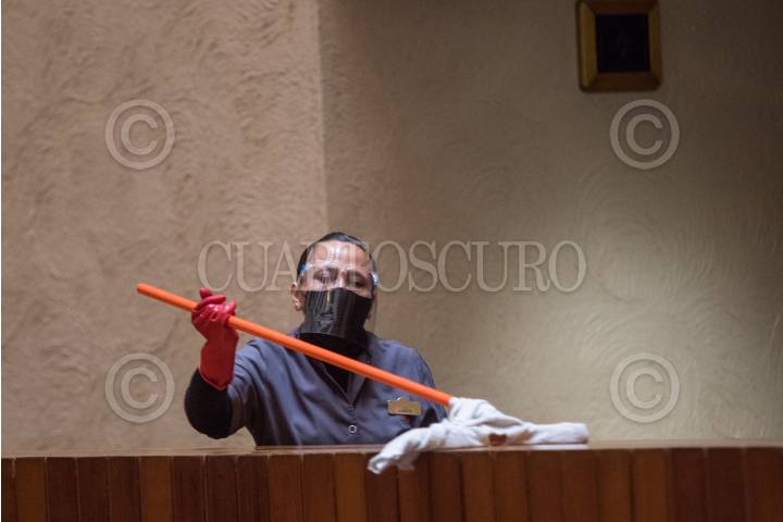 Una trabajadora con cubrebocas y careta limpia parte del inmobiliario de un hotel.