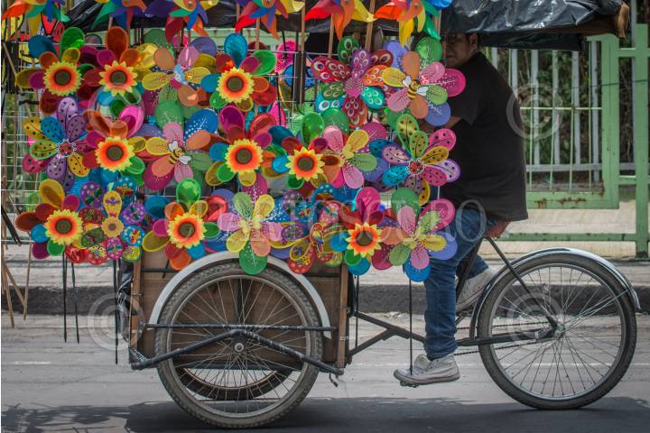 Un vendedor de artesanías transita en su bicicleta sobre avenida José María Vertiz.