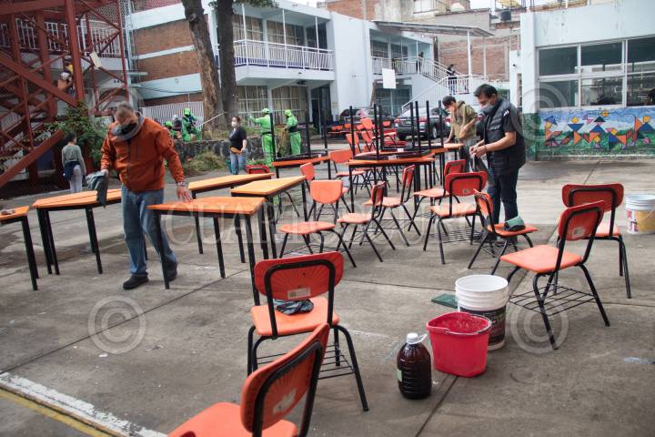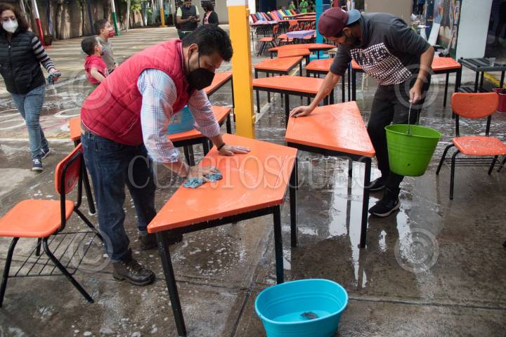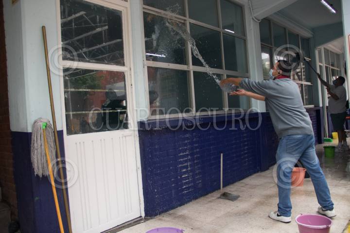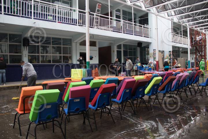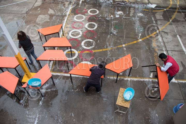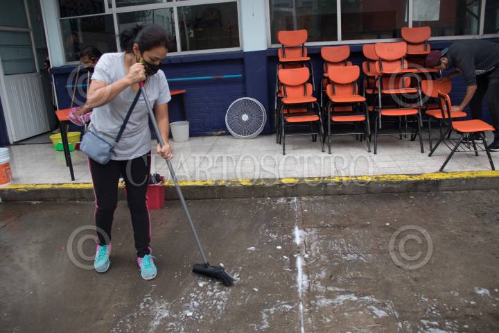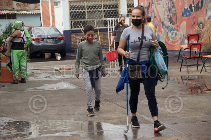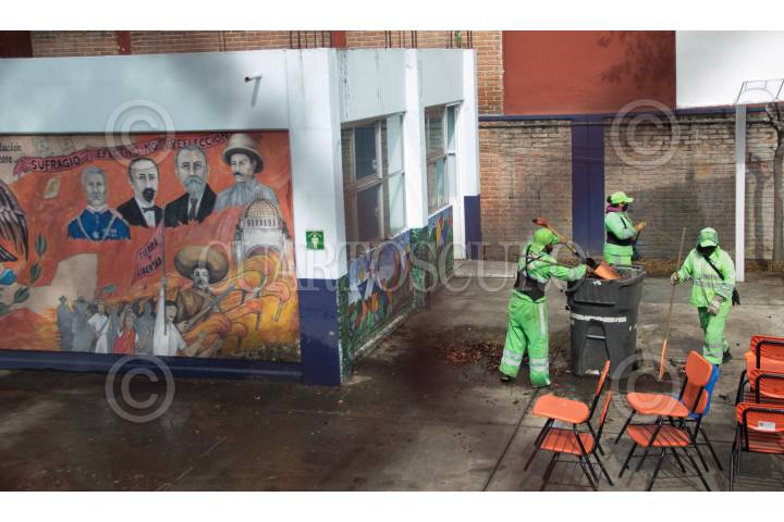 Tequio de limpieza en la escuela Primaria "Francisco Menéndez", de la alcaldía de Benito Juárez.