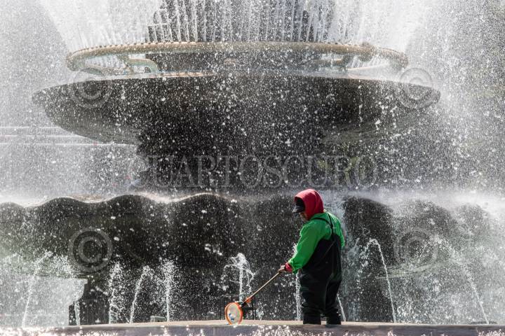 Un trabajador limpia las aguas de la fuente de la Diana.