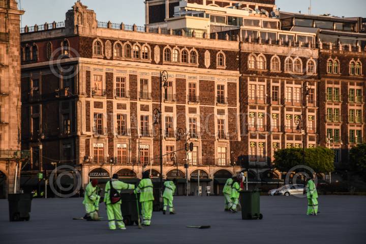 Trabajadores de limpia de la capital realizan sus actividades en la plancha del zócalo capitalino.