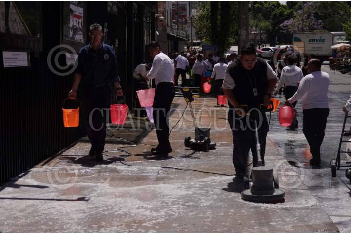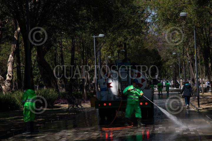 Trabajadores capitalinos limpian con agua a presión los pasillos de la Alameda Central.
