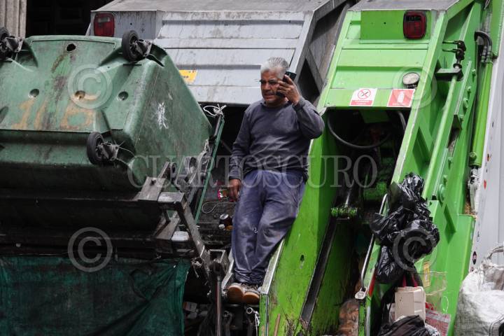 CIUDAD DE MÉXICO, 28MAYO2025.- Un trabajador habla por teléfono recargado en un camión de la basura en el Centro Histórico. FOTO: GRACIELA LÓPEZ/CUARTOSCURO.COM