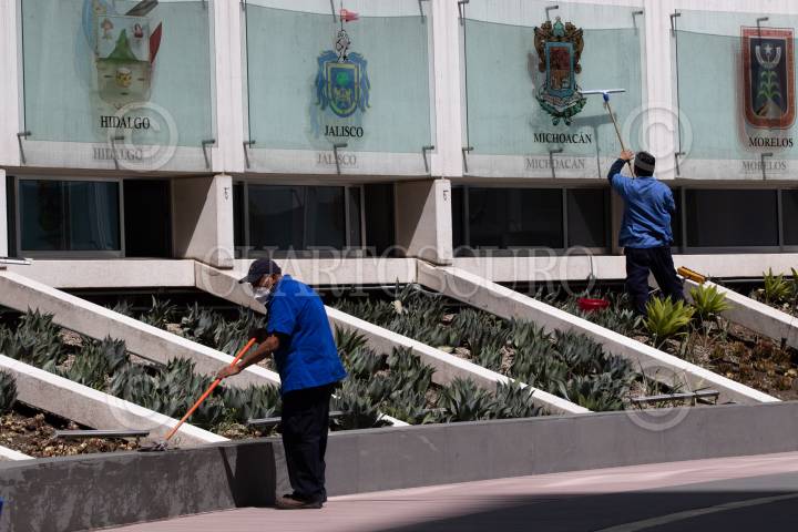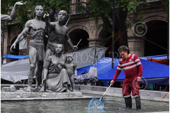 CIUDAD DE MÉXICO, 28MAYO2025.- Un trabajador de limpieza remueve la basura de la fuente que se encuentra frente a la Suprema Corte de Justicia de la Nación (SCJN). FOTO: GRACIELA LÓPEZ/CUARTOSCURO.COM