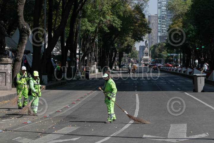 CIUDAD DE MÉXICO, 30DICIEMBRE2023.- Trabajadores de limpieza del gobierno capitalino barren sobre Paseo de la Reforma. FOTO: MOISÉS PABLO/CUARTOSCURO.COM