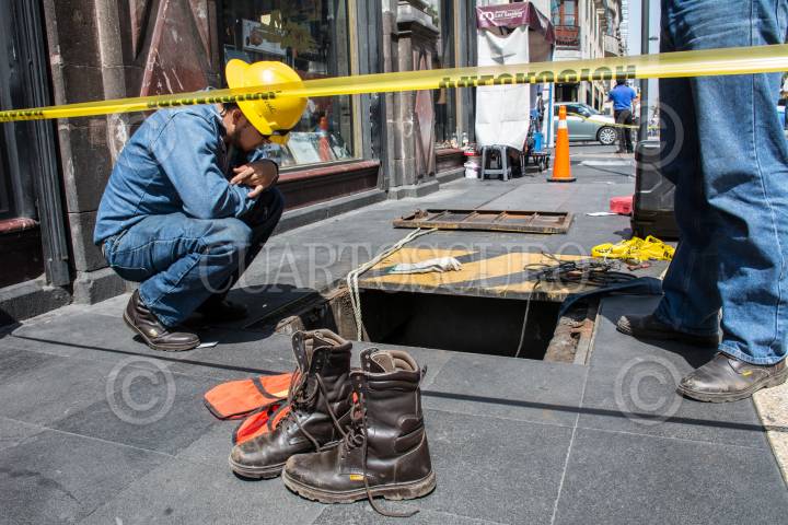 CIUDAD DE MÉXICO, 09JUNIO2017.- Trabajadores realizan mantenimiento a conductos eléctricos cerca de la avenida Francisco I. Madero número 51. FOTO: MARIO JASSO /CUARTOSCURO.COM