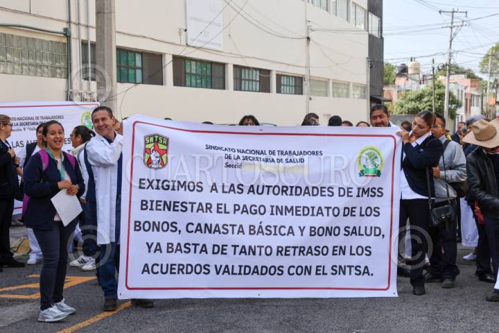 TOLUCA, ESTADO DE MÉXICO, 16JULIO2025.- Trabajadores del sector salud adscritos a la Jurisdicción Sanitaria número 2 de Toluca reunidos a temprana hora y con mantas se fueron a paro laboral, son al menos 85 clínicas de cuatro municipios las que dejarán de dar servicio ante el incumplimiento en la transición IMSS-Bienestar, demandan el pago de bonos atrasados, falta de medicamentos, insumos y material de curación, entre otros. FOTO: CRISANTA ESPINOSA AGUILAR /CUARTOSCURO.COM