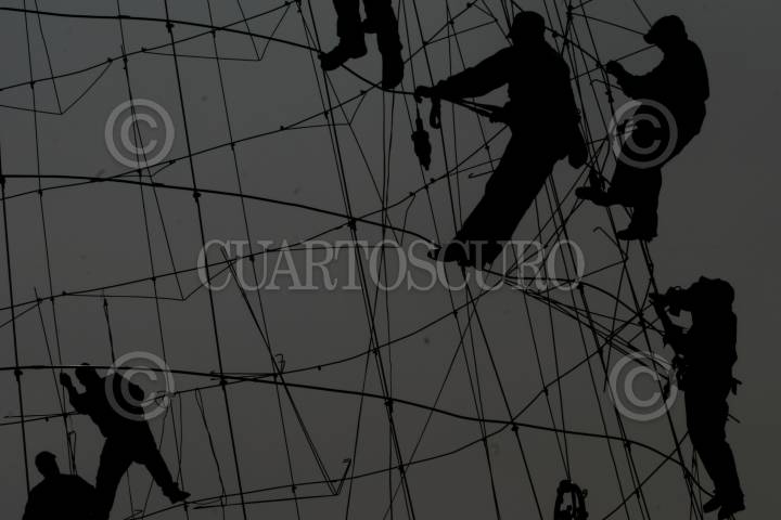 MÉXICO, D.F., 11SEPTIEMBRE2009.- Trabajadores del Gobierno del Distrito Federal trabajan en los últimos detalles en montar estructuras frente a Palacio de Ayuntamiento, donde este Martes 15 se realizará la celebración del bicentenario de la Independencia de México FOTO: SÁSHENKA GUTIÉRREZ/CUARTOSCURO.COM