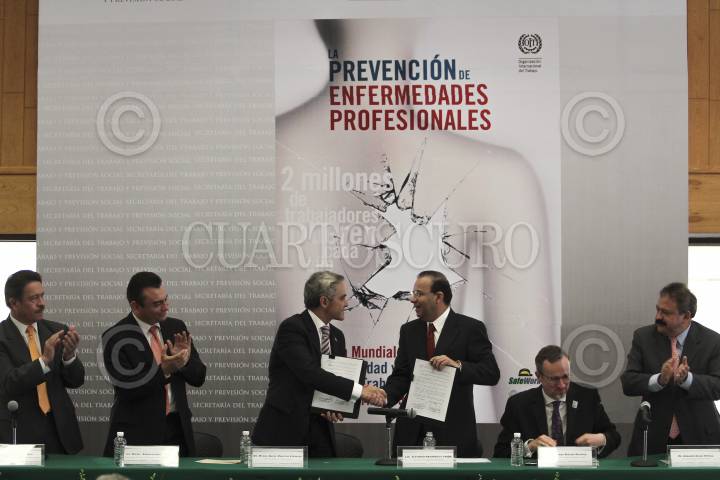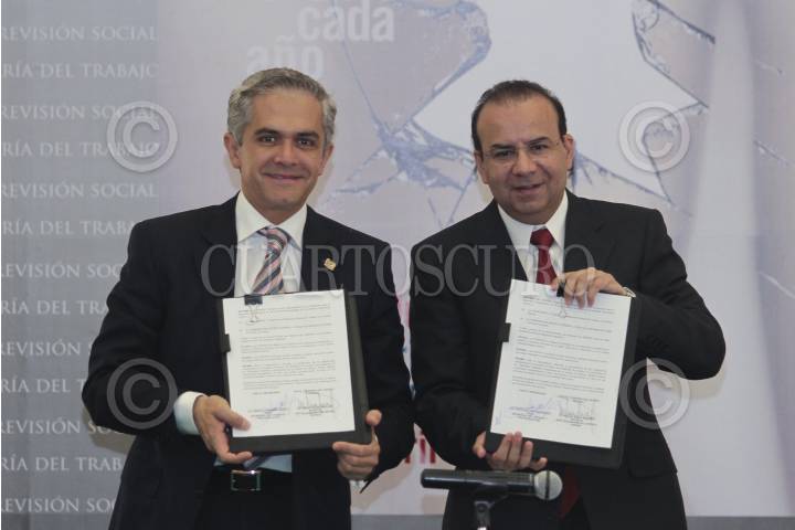 MÉXICO, D.F., 29ABRIL2013.- Miguel Ángel Mancera, jefe de Gobierno del Distrito Federal, acompañado de Alfonso Navarrete Prida, titular de la Secretaria de Trabajo y Prevención Social, firmaron un convenio de colaboración con el fin de prevenir accidentes y enfermedades en el trabajo. FOTO: GUILLERMO PEREA /CUARTOSCURO.COM