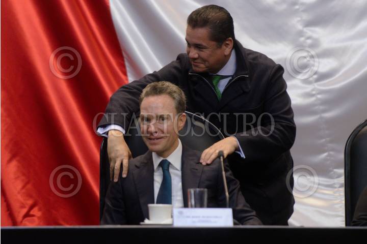 Marcelo Ebrard, secretario de Relaciones Exteriores, y Manuel Velasco, senador y coordinador del PVEM, durante la Cuarta Reunión Plenaria del Grupo Parlamentario del PVEM realizada en el salón Legisladores de la República de la Cámara de Diputados.